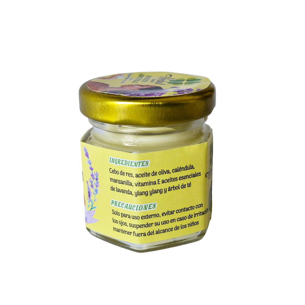 Cebo de res, aceite de oliva, caléndula, manzanilla, vitamina E, aceites esenciales de lavanda, ylang ylang y árbol de té.